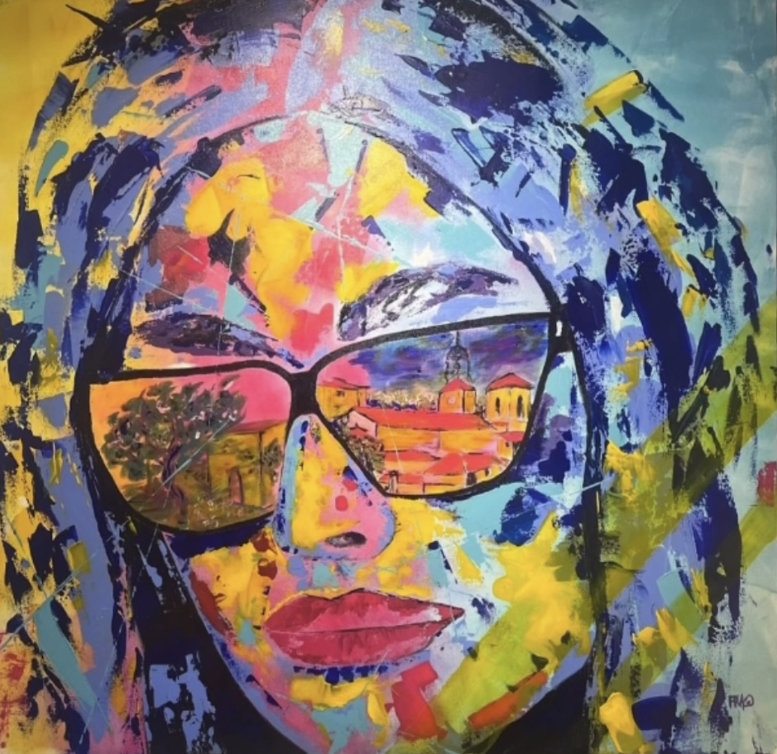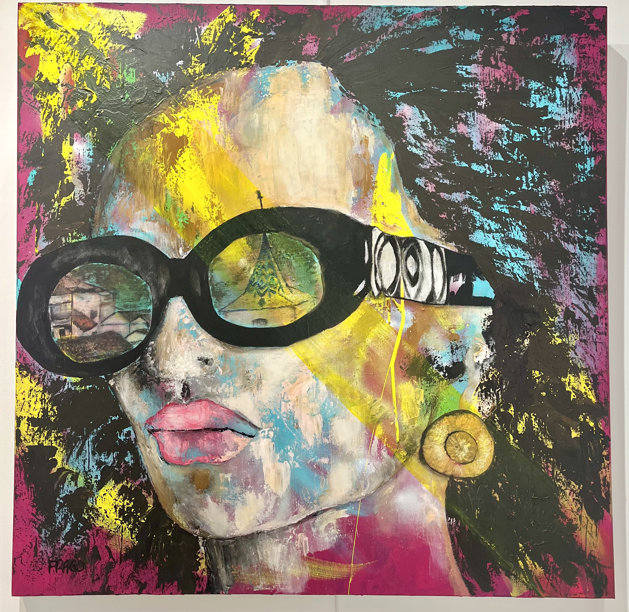Ma série des Têtes de l’Art, portraits d’icônes d’hier et maintenant , ma série Les Bavardeuses, femmes à grandes lunettes dans lesquelles se reflètent les villes ou villages d’où elles viennent ( La Seillanaise a obtenu le prix du public lors d’une exposition)