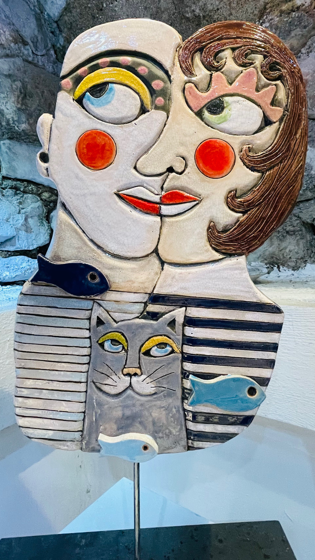 Mes personnages sont réalisés en terre sculptée en bas relief puis émaillée avec un émail préparé par mes soins