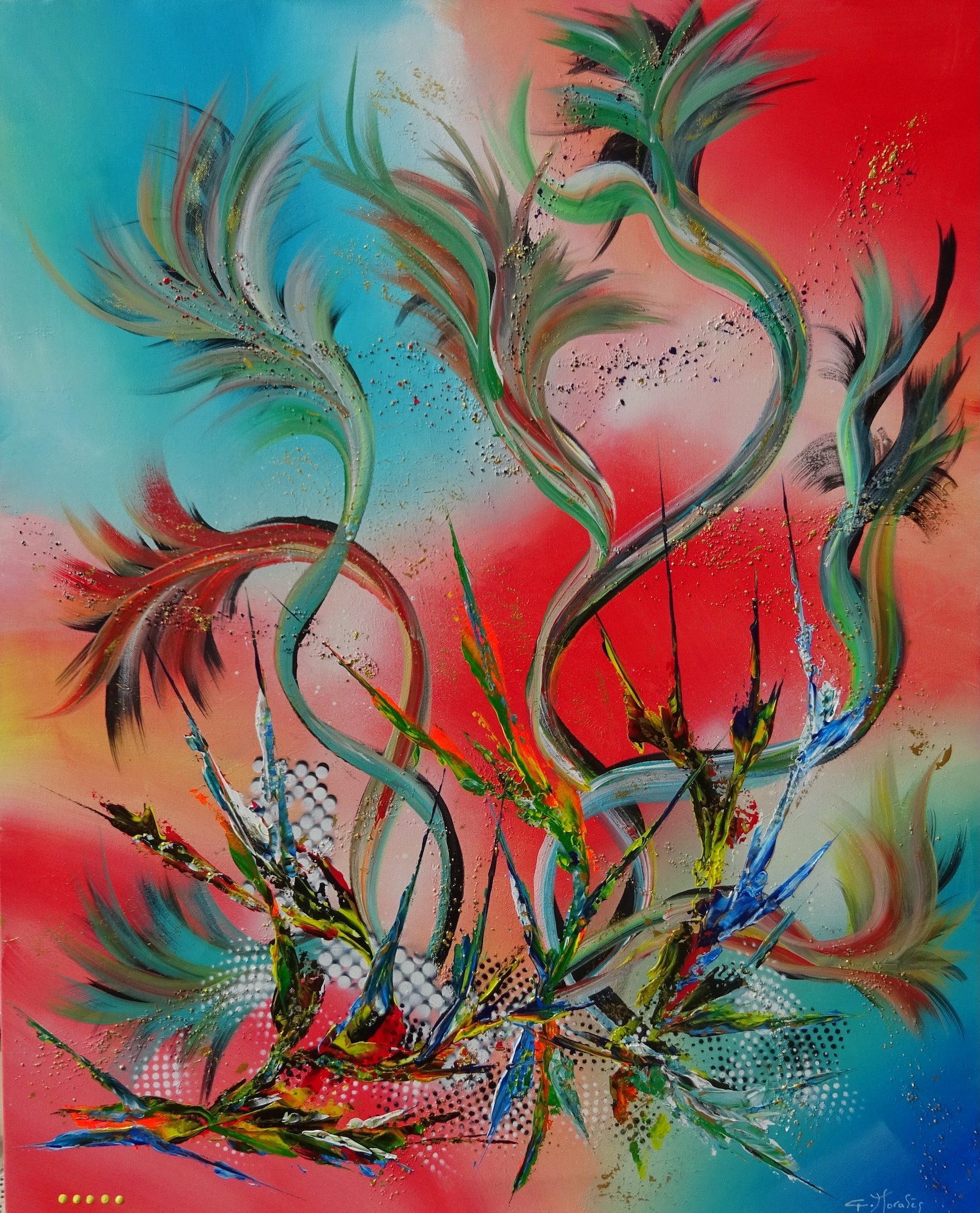 L’élaboration de mes tableaux n’est qu’une suite de flashs dont les cheminements sont des vibrations inconsciemment dans le mouvement, les couleurs m’emportent lorsque je les mélange et viennent me surprendre en m’autorisant l’expression.