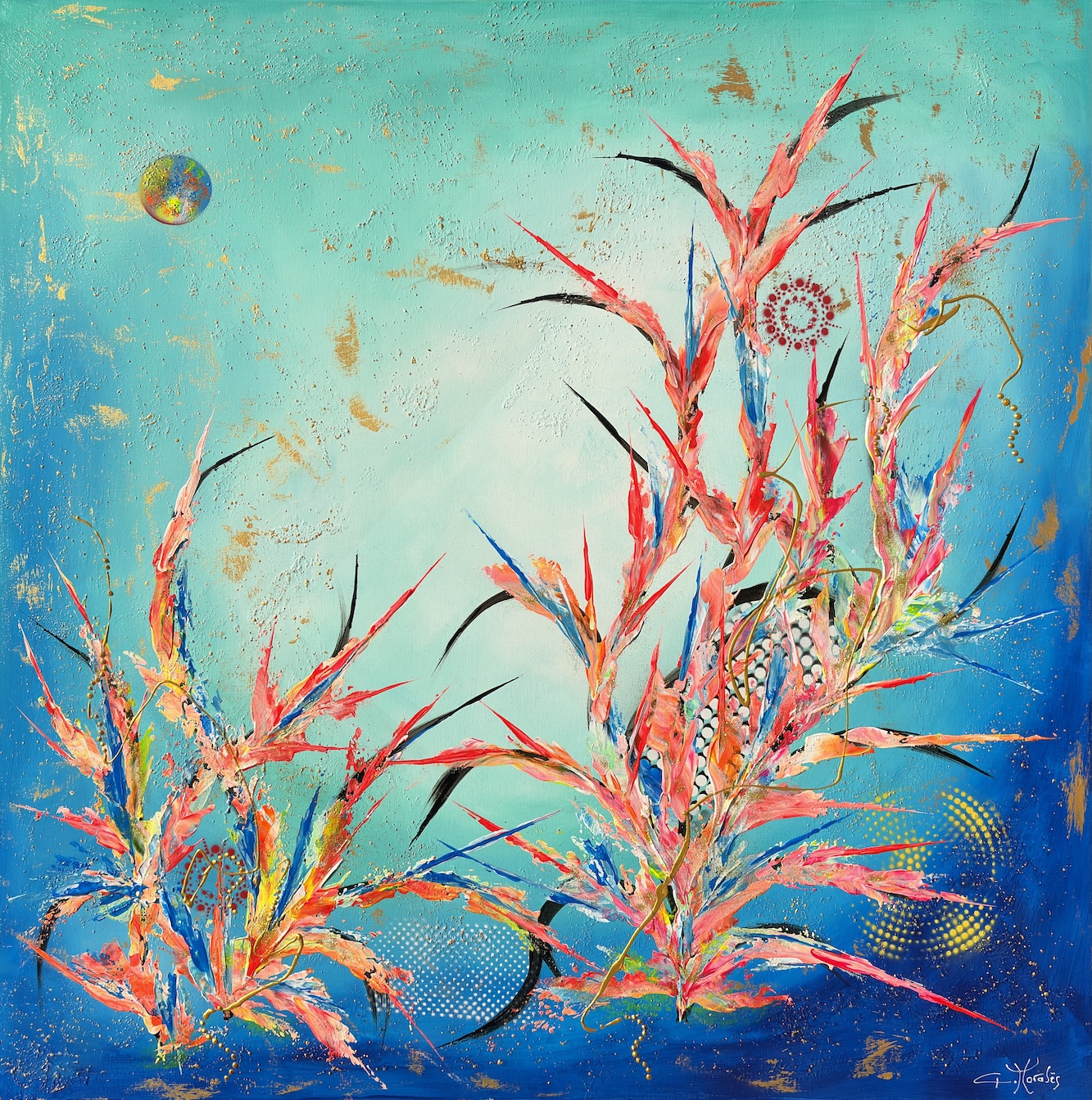 Mes créations prennent place dans un univers contemporain et abstrait, mêlant acrylique, collage, fragments végétaux et minéraux, déployés sur des formats généreux.