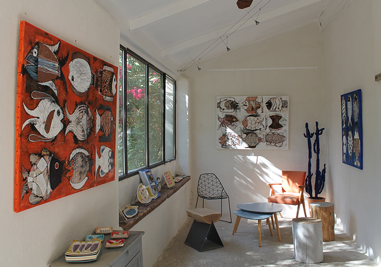 Exposées en extérieur, autour du caveau, comme à l’intérieur, dans un ancien poulailler transformé en galerie d’art, les oeuvres de Michel Jean, Goulven, Manuel Paoli, Gerhard Doehler, Carine Leroy-Braham, Patrice Novarina, Vida Verba, Monsieur Z, Charlotte Culot, Daniela Belfiore, Olivier Caloin, Pascal Cessou, Lionel Borla et Cécile Colombo font corps avec la volonté du domaine : regrouper artistes, vignerons et visiteurs pour honorer l’esprit humaniste qui habite chacun d’entre nous.