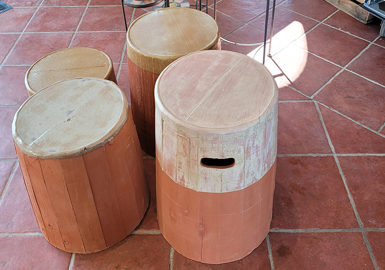 « Mémoire de formes – cornues », leur série de tabourets réalisés à la main en terre de Salernes et émaillés avec des cendre de vigne, rend hommage aux vignerons et à l’époque des vendanges manuelles. Ces tabourets en céramique, qui peuvent aussi servir de tables d’appoint, sont estampés dans des cornues et ravivent, via leur empreinte, la mémoire de ces ustensiles. Déplaçables, ils sont destinés à créer des moments chaleureux, de convivialité, de partage et d’humanité.